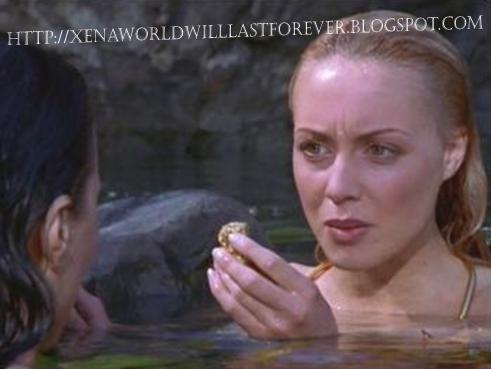 Xena retorna com Gabrielle ao lago para se desculpar e devolver o Ouro do Rin às donzelas: