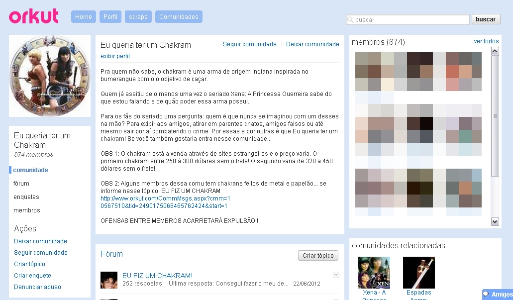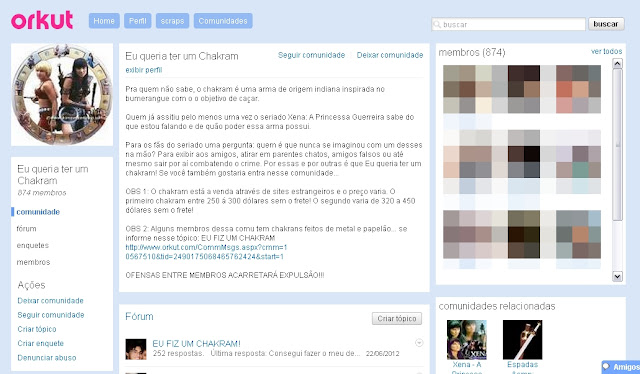 “E quem não quer?” Essa comunidade foi uma das que eu mais participei. Um cara havia feito um chakram de papelão e mostrado a gente. E com isso várias pessoas começaram a fazer e trocar ideia, eu mesmo cheguei a fazer algum(s). Teve um cara que tirou a foto de um chakram de metal que ele tinha forjado. Eu falei um pouco com ele, ele tinha me dado umas dicas e até me passado as medidas do chakram. Esse cara usava o nome de Xeno e tinha uns vídeos dele fazendo acrobacias. Eram os vídeos do Doug. Quando conheci o Doug em 2011, logo contei a ele essa história pra saber se ele lembrava. Mas concluímos que aquele Xeno poderia ser um fake do Doug. Mais uma coisa que me divertia nessa comunidade era o jogo “chakram, espada, cajado”: Você respondia qual arma iria usar para bater na pessoa acima. Prazeres bobos que só Orkut proporcionava.