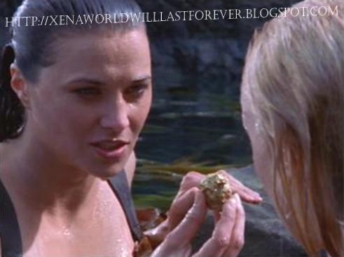 Xena retorna com Gabrielle ao lago para se desculpar e devolver o Ouro do Rin às donzelas: