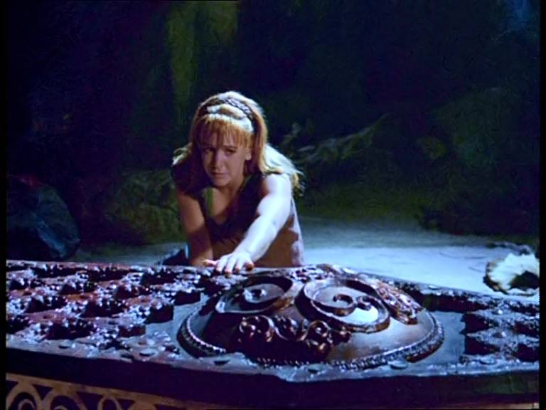 lança-las ao rio de lava. Xena amarra uma corda na cintura e se joga para pegar